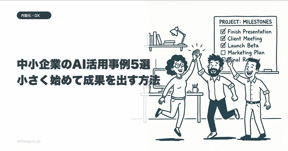 大企業はすでに大量のデータを持っていることが多いですが、中小企業は「そもそもデータが溜まっていない」ところから始めなければなりません。AI活用の前に、まずデータが蓄積される仕組みを作ることが不可欠です。この「データが先、AIが後」の考え方は「AIで業務効率化する導入ステップ」で詳しく解説しています。